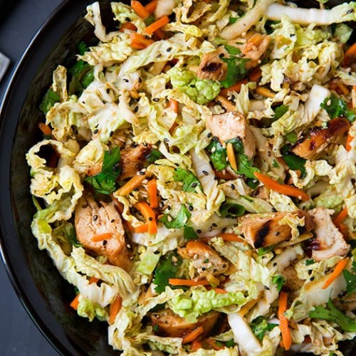 Grilled ginger-sesame chicken breast served over crisp chopped romaine lettuce with shredded carrots, fresh English cucumbers, and green onions, served with sliced almonds and sesame seeds, and a vibrant sesame Asian dressing.
