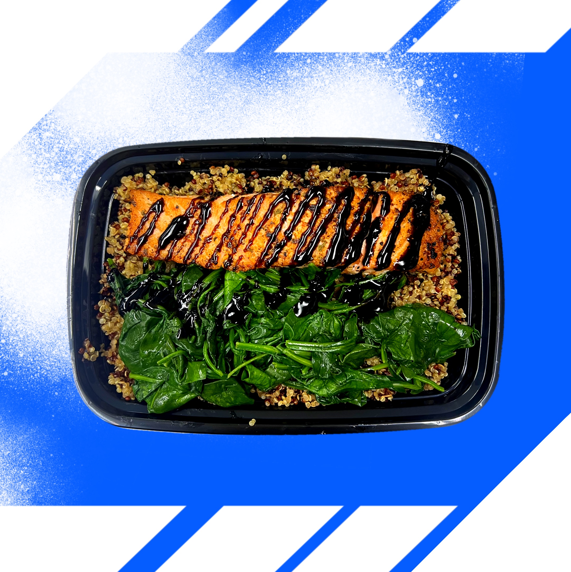 salmon, quinoa, chicken broth (chicken stock, contains less than 2% of: yeast extract, dehydrated chicken, natural flavoring, carrot juice concentrate, celeriac juice concentrate, chicken fat, onion extract), spinach, balsamic vinegar, kosher salt, garlic, red peppers, brown sugar, onion, paprika, orange peel, carrot, basil